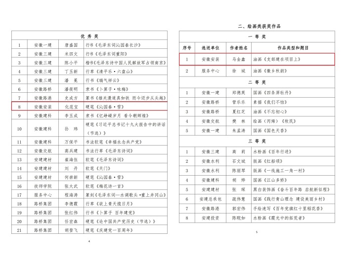 9月29日,集團公司工會通報了“翰墨寫初心 丹青頌黨恩”職工書畫攝影作品展評選結果,安徽安裝公司選送的五幅作品榜上有名。其中馬金鑫的油畫作品《支部建在項目上》榮獲繪畫類一等獎,任禹豪的攝影作品《幸福是干出來的》榮獲攝影類二等獎,化范寶的硬筆書法作品《沁園春·雪》和程茂麗的攝影作品《攀登》、胡欣欣的攝影作品《齊心》分別榮獲書法類優秀獎和攝影類優秀獎。