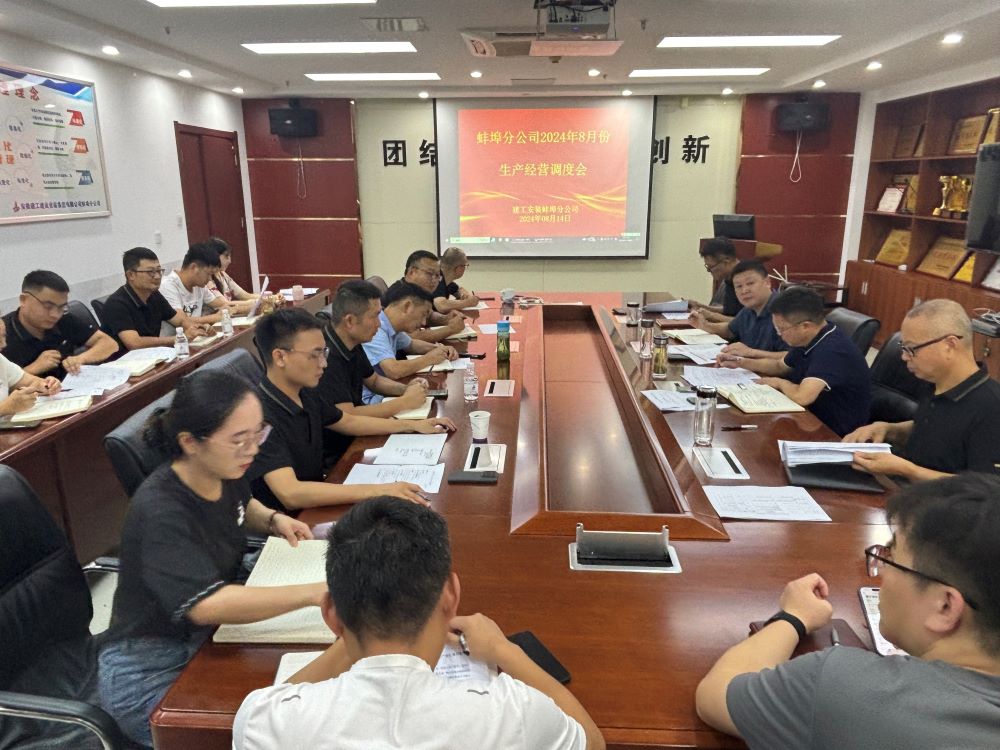 8月14日上午,蚌埠分公司組織召開8月份生產經營調度會,分公司領導班子成員、所屬各項目部、機關各部門負責人及工程管理部全體員工參加會議,會議由分公司副經理張斌主持。